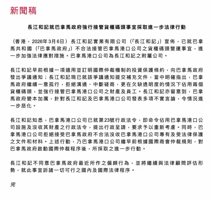 今年2月23日,巴拿马政府突然翻脸,凭一纸行政法令强行接管两座码头,禁止长和方人员入场、扣押公司文件,还接连发布不实言论,彻底中断沟通磋商。面对这种无视契约精神的强夺,长和没忍:先启动国际仲裁,索赔至少20亿美元;3月6日再加码,同步走巴拿马本地行政申诉+国际投资条约仲裁双路径,明确表态绝不接受象征性补偿,要穷尽法律手段捍卫权益。