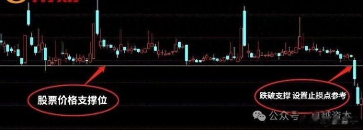 这种方法是通过市场前期价格的支撑,股价有效跌破支撑线位后设置参考股票止损点(如下图所示)